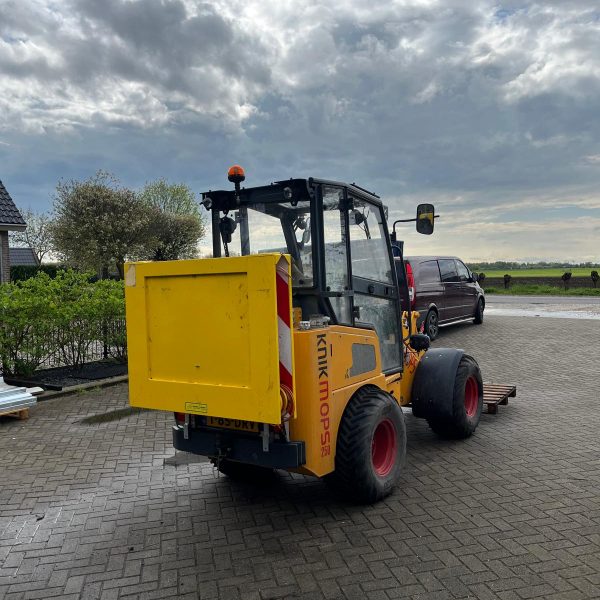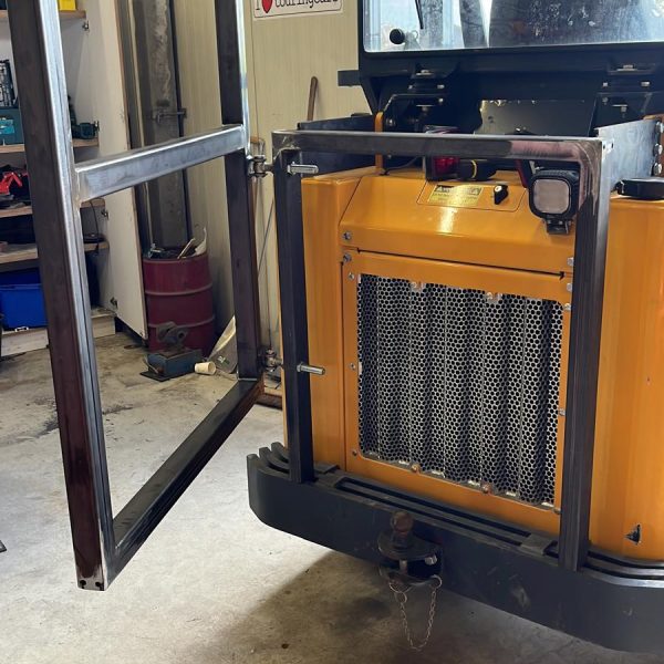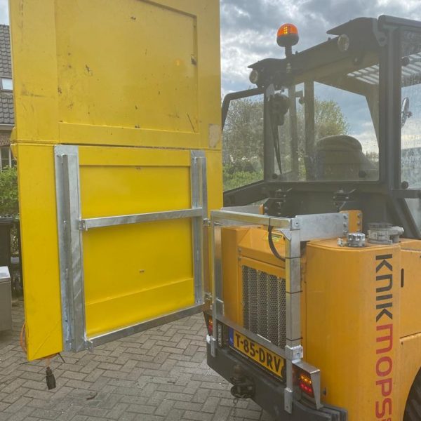 Voor deze shovel een frame gemaakt waar het actie bord op gemonteerd kan worden. Hier voor hebben we de verlichting moeten verplaatsen naar een nieuwe lichtbalk onder het bord. Het frame is in de werkplaats op maat gemaakt en heeft de functie gekregen om het weg te kunnen draaien als er onderhoud aan de motor gepleegd moet worden. Dit frame is verzonken waardoor het goed behandeld het werk veld in kan.
