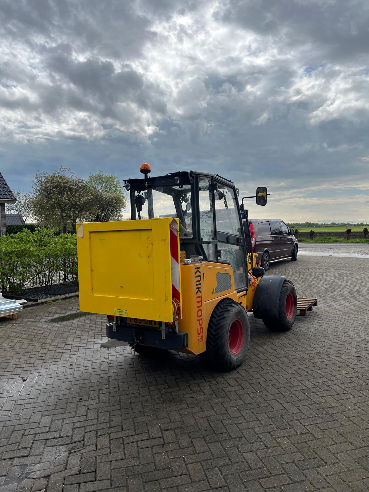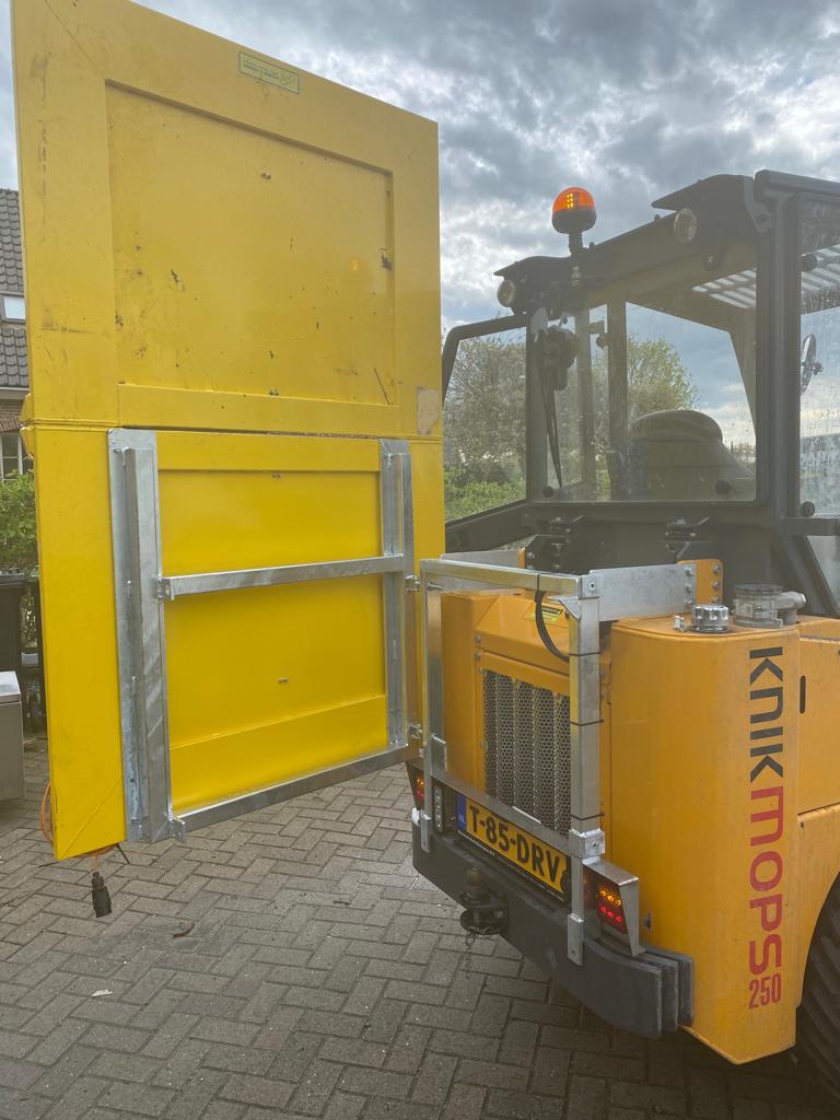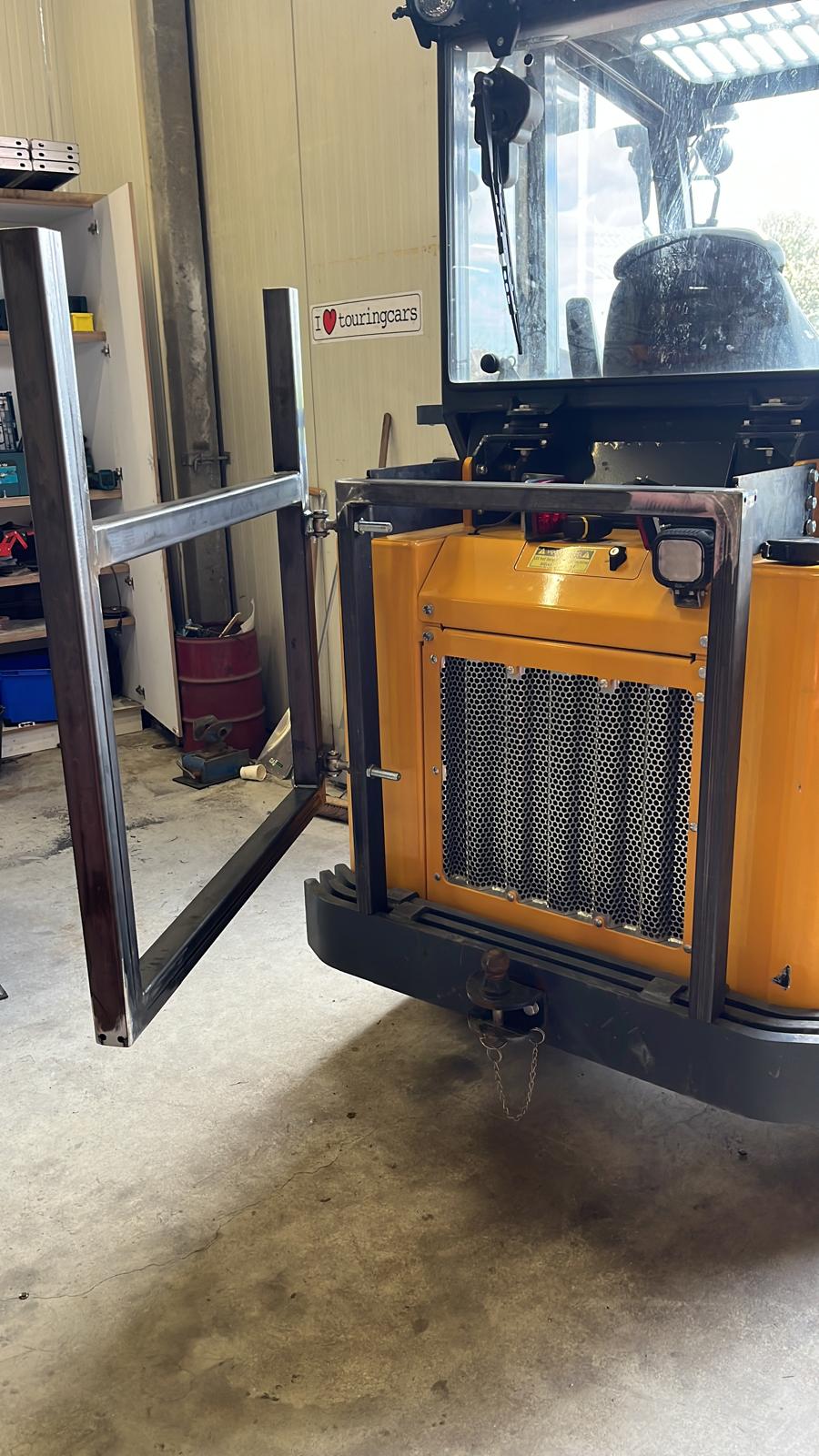 Voor deze shovel een frame gemaakt waar het actie bord op gemonteerd kan worden. Hier voor hebben we de verlichting moeten verplaatsen naar een nieuwe lichtbalk onder het bord. Het frame is in de werkplaats op maat gemaakt en heeft de functie gekregen om het weg te kunnen draaien als er onderhoud aan de motor gepleegd moet worden. Dit frame is verzonken waardoor het goed behandeld het werk veld in kan.