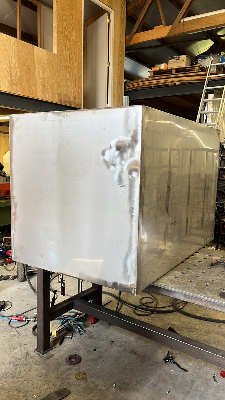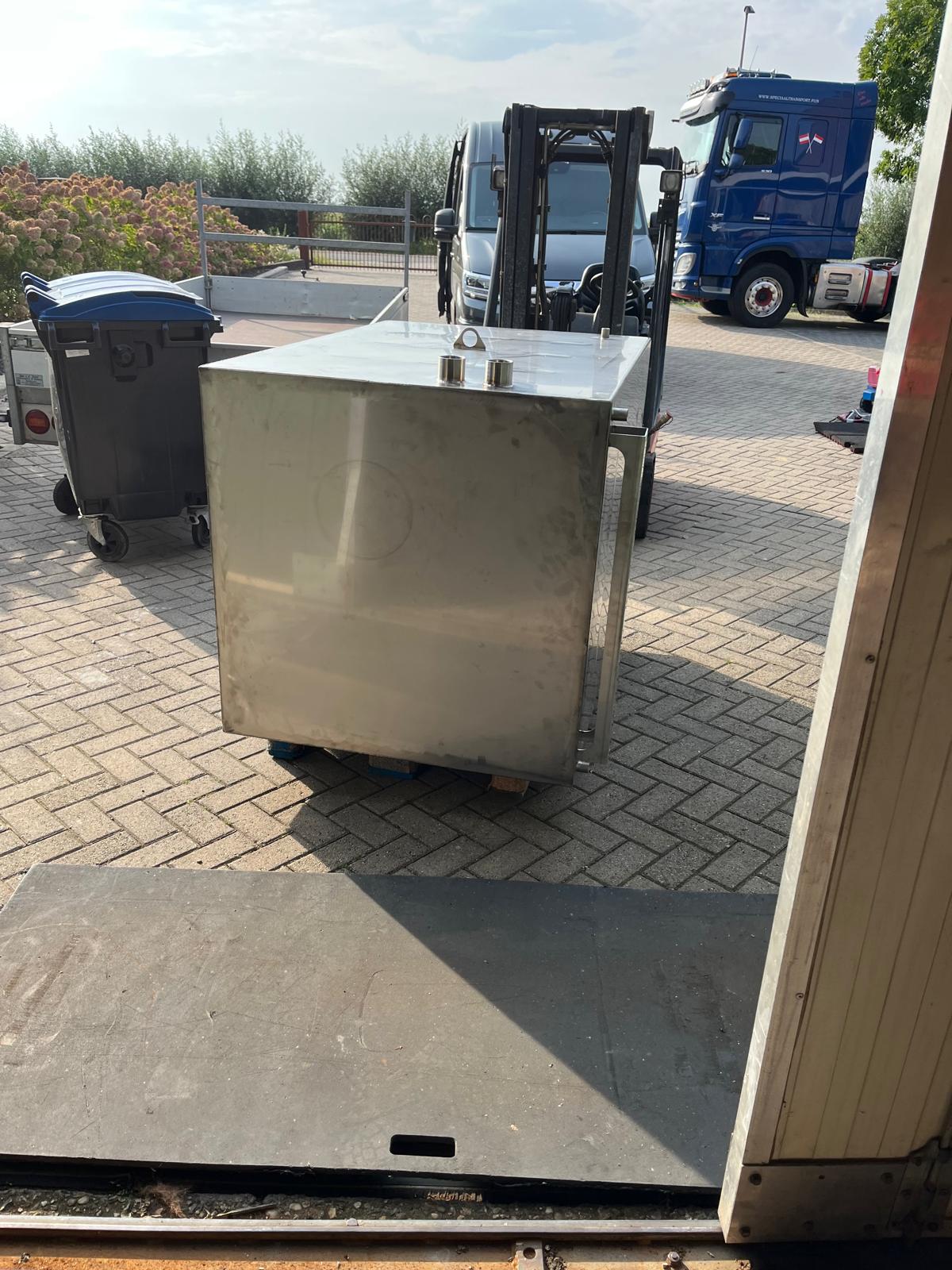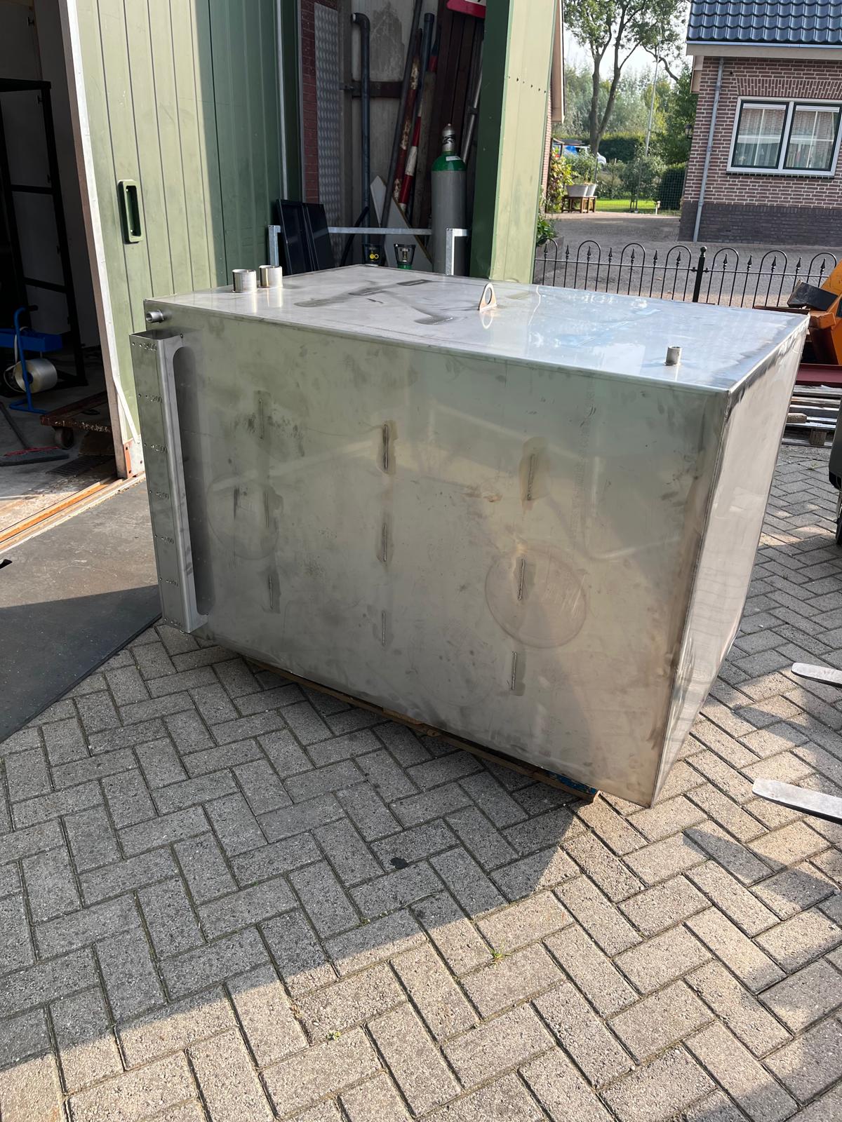 Voor aan boord van een binnen vaart schip deze 1000 liter rvs tank gemaakt. In deze tank word de adblue opgeslagen voor de motoren van het schip. Op deze tank hebben een schaal verdeling gemaakt voor het peilglas om te kunnen zien hoeveel liter er aan boord is en een aantal draad sokken om de nodige aansluitingen te kunnen realiseren voor de aansluiting op de motoren.