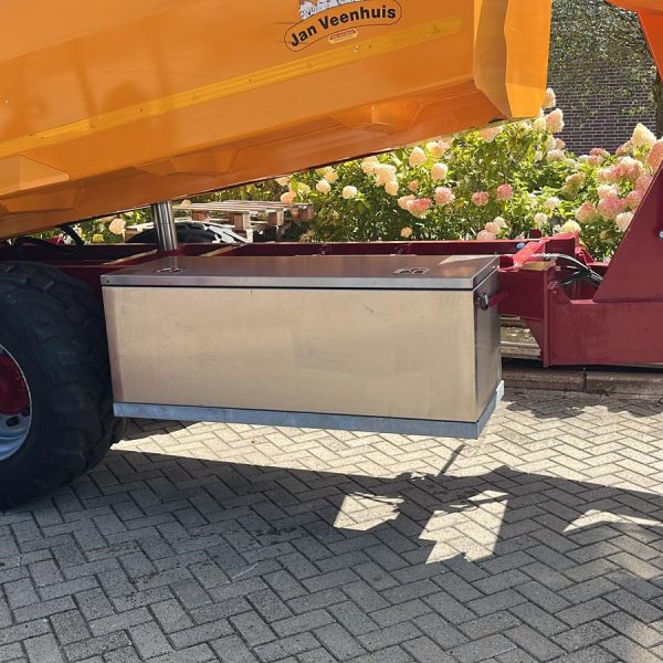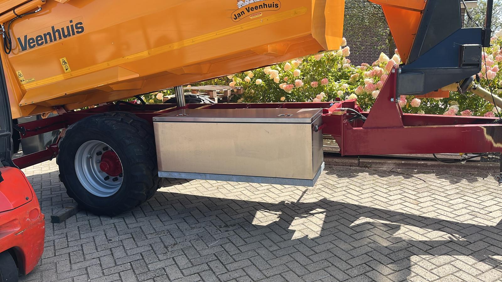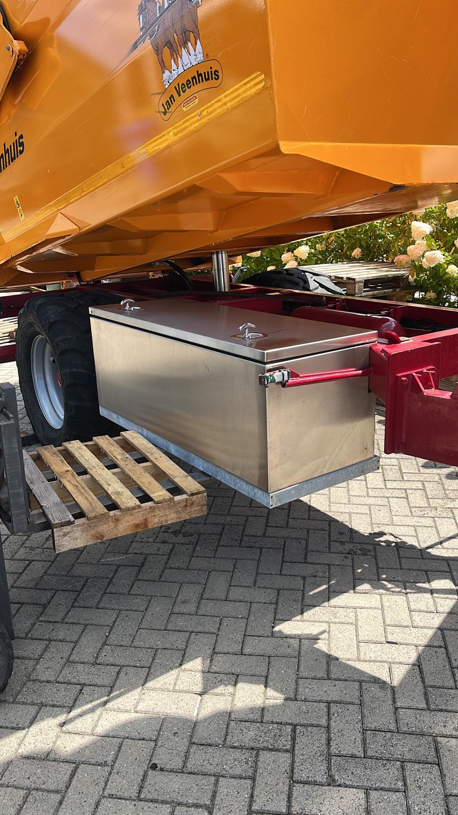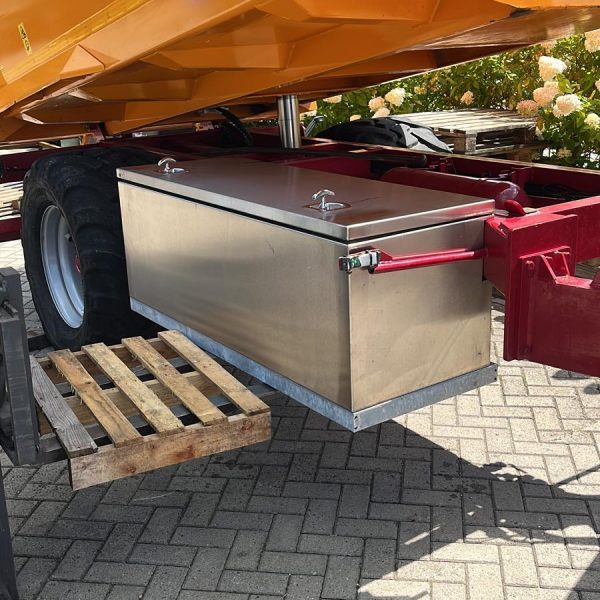 Onder deze kieper hebben we een rvs kist gemaakt. Hiervoor hebben we eerst een staal sub frame gemaakt en laten galvaniseren. Vervolgens hebben wij de rvs kist gemonteerd aan de kieper.