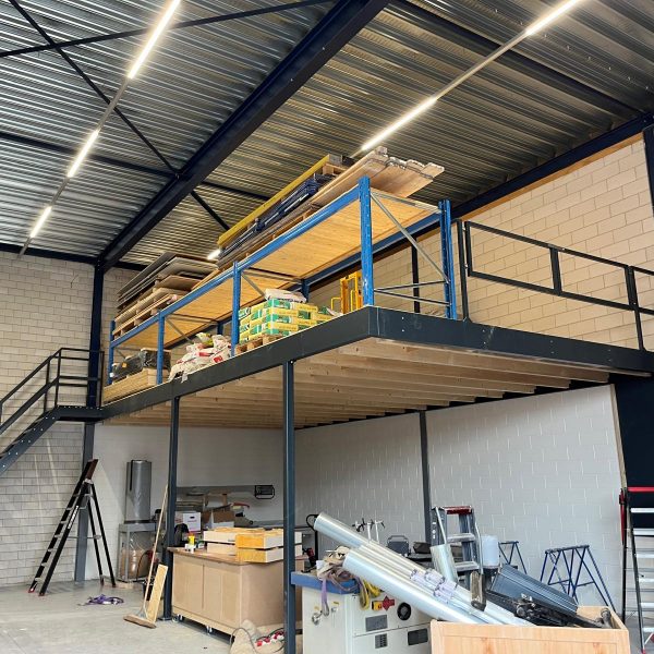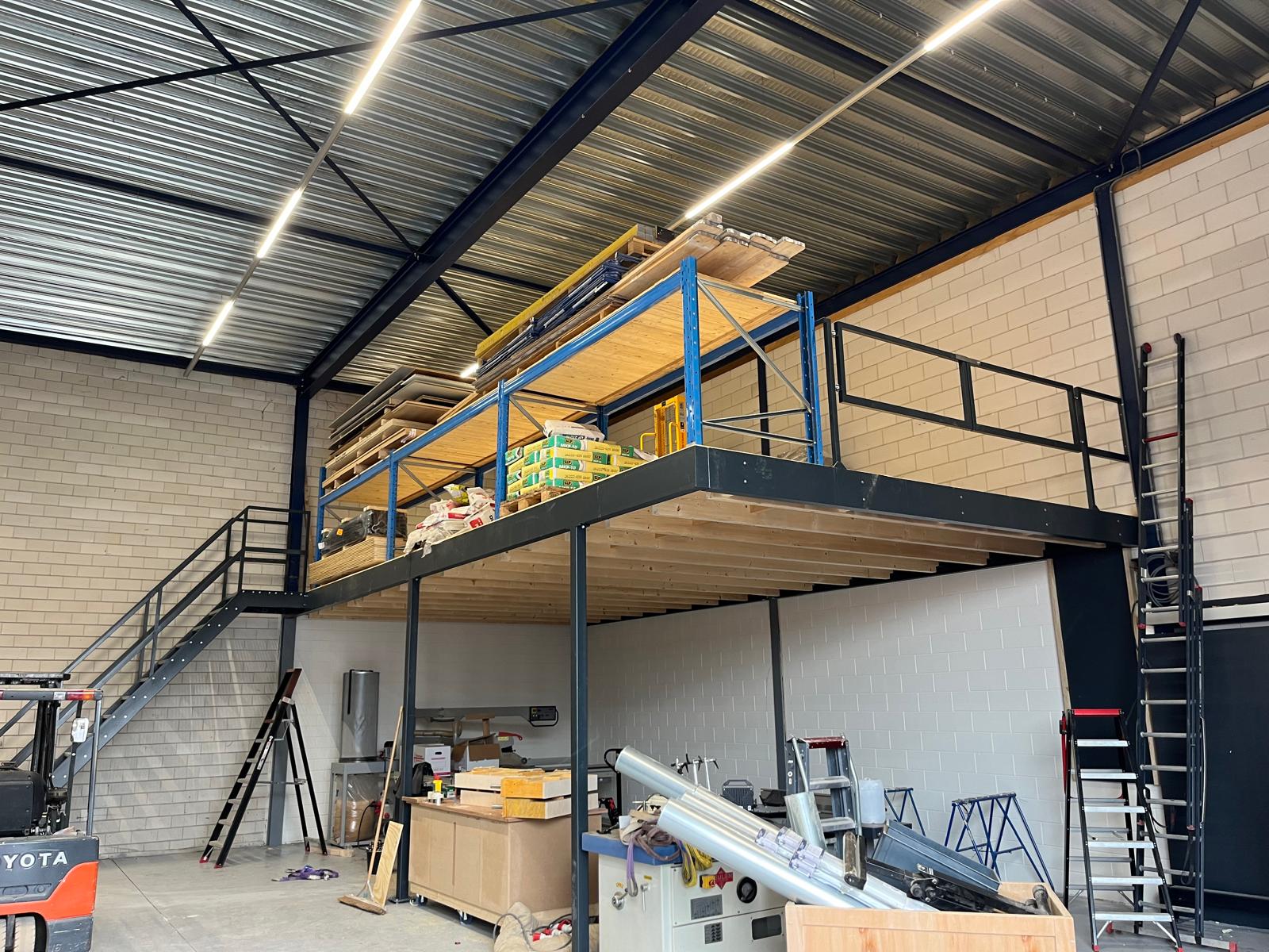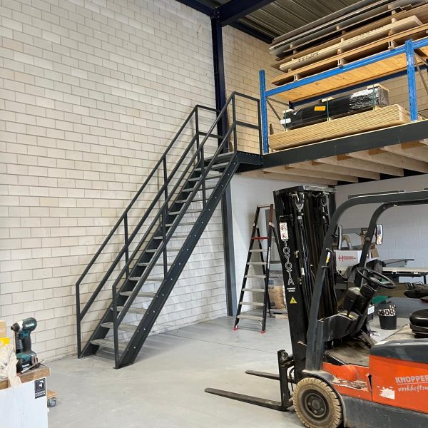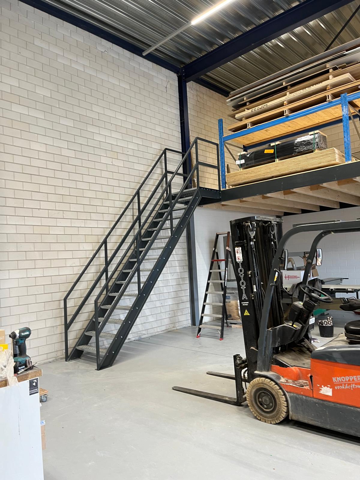 Voor deze werkplaats hebben wij een mooie verdiepingsvloer gemaakt met leuning werk en een trap naar boven.
